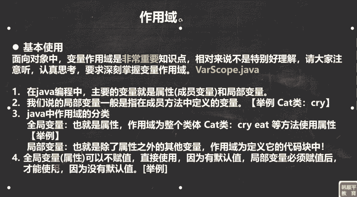 class Exercise03 { // 全局变量(就是一个类)在内存中呆的时间要久一点 // 全局变量会随着对象的创建而创建,随着对象的销毁而销毁 int a = 10; // 局部变量(就是一个方法)在内存中呆的时间要短一点 // 局部变量会随着方法的执行而创建,随着方法的接收而销毁 // 也就是说该方法被执行完之后,该方法中的所有变量就会被销毁 public void num() { int a = 100; } } public class VariadicScopeDetail01 { public static void main(String[] args) { Exercise03 a = new Exercise03(); a.num(); } }