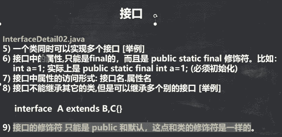 interface IA { int a = 10; void in(); } interface IB { void id(); } interface IC extends IA,IB {} // 一个类调用一个接口,但那个接口又继承了多个接口 // 那么该类不但要实现调用接口的抽象类,还要实现调用接口继承的接口中的抽象类 // 接口里面的属性可以不用去实现 class E implements IC { public void in() { } public void id() { } }