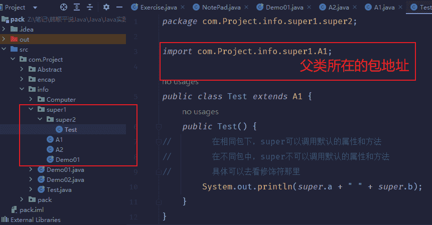 ),把父类所在的 完整的包地址导包到自己的子类中总结:公开类无论在什么地方都可以被调用(在别的包中调用公开类要记得导入该类的包)