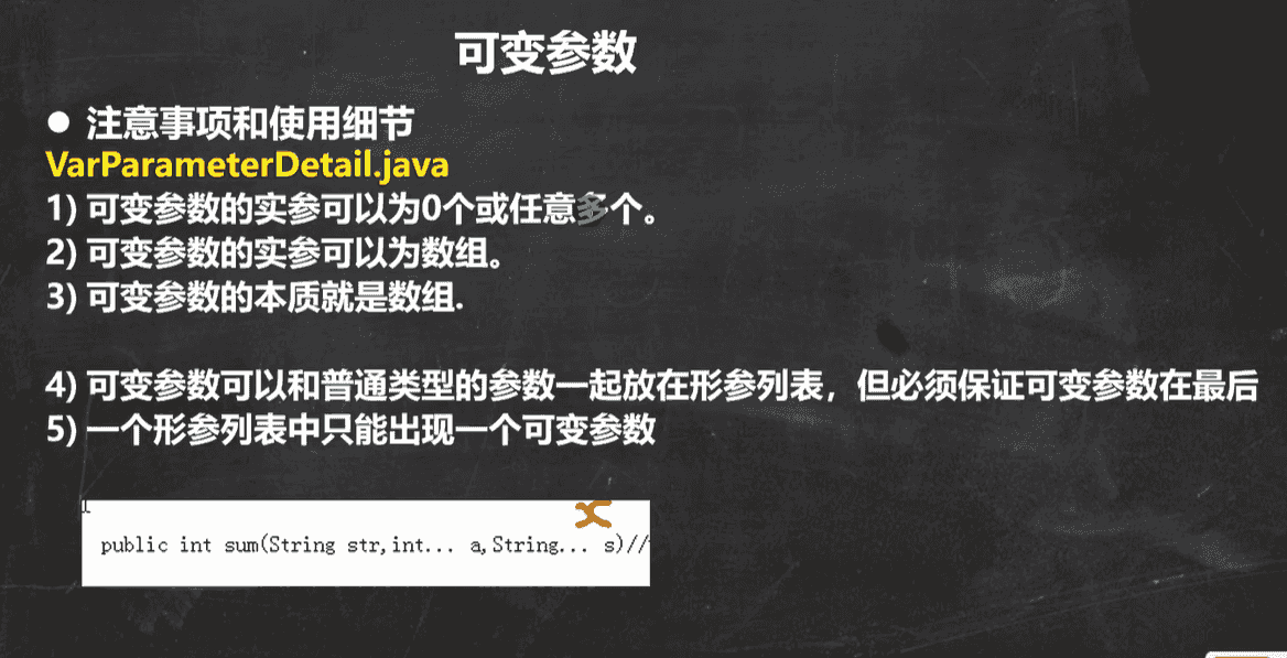 // 一个形参列表中只有只能出现一个可变参数 public void num(int a, int... b) { } /* 错误写法 public void num1(int... a1, int... b) { } */