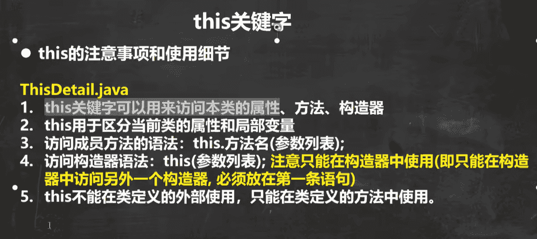 关键字调用别的构造器class This { public This() { // 调用构造器 /* 注意事项 如果想用this关键字去调用别的构造器 前提是该this关键字只能在构造器中使用 this语句调用别的构造器要放在第一条 */ this("张三", 18); } public This(String name, int age) { System.out.println(name); System.out.println(age); } } public class this02 { public static void main(String[] args) { This t = new This(); t.This2(); System.out.println("This结束"); } }