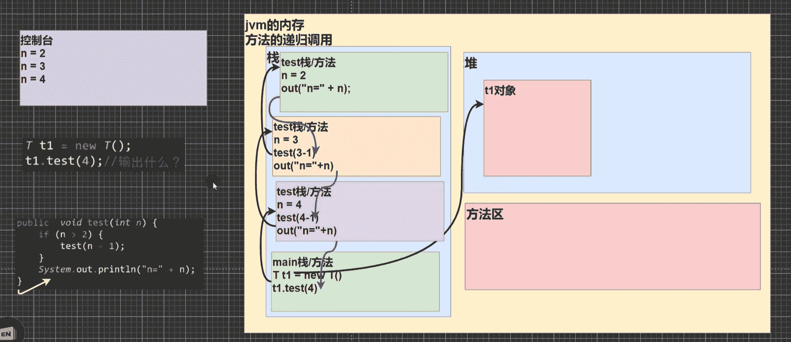 // 然后在将 4 赋值给 Recursion 方法,所以 Recursion 中的n = 4