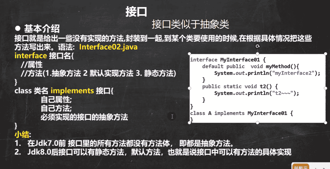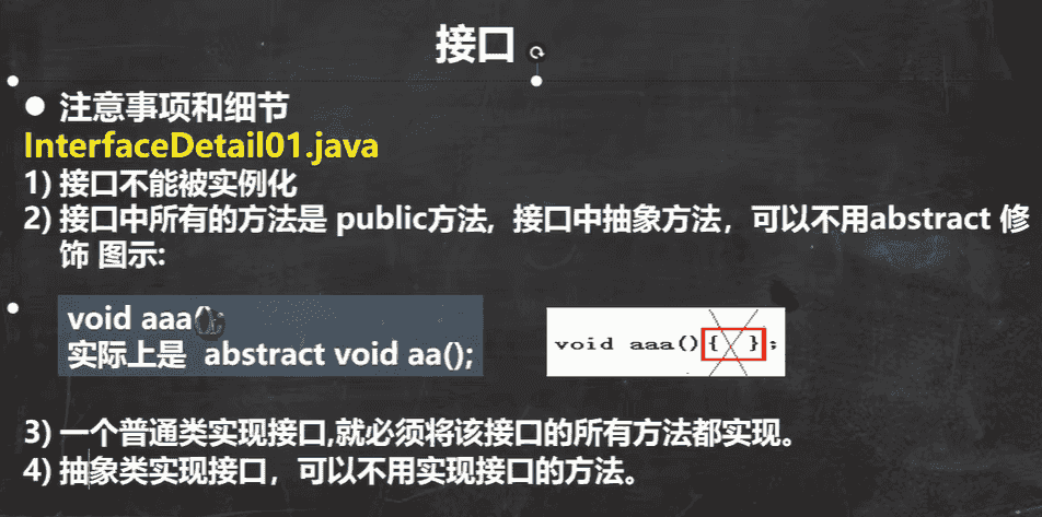 接口和抽象类一样,如果你要调用接口,那么你就要实现该接口的所有抽象方法
