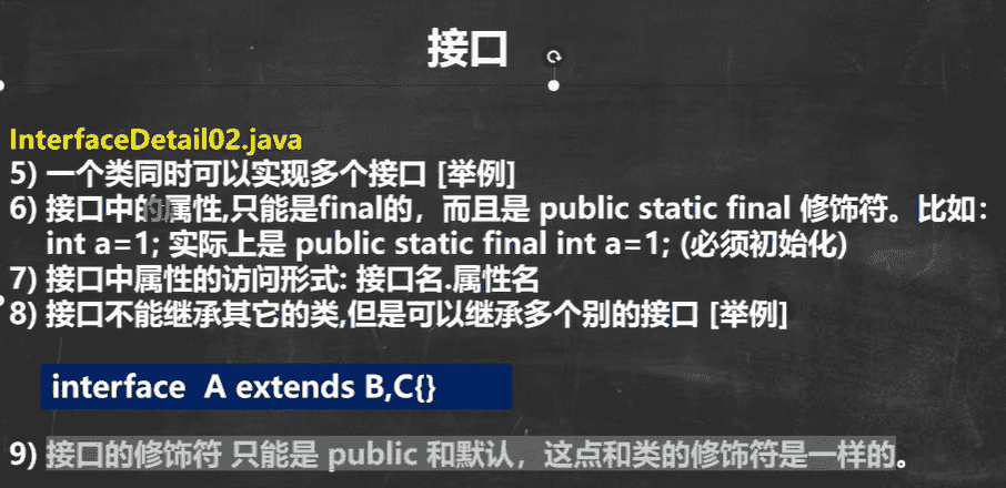 interface IA { int a = 10; void in(); } interface IB { void id(); } interface IC extends IA,IB {} // 一个类调用一个接口,但那个接口又继承了多个接口 // 那么该类不但要实现调用接口的抽象类,还要实现调用接口继承的接口中的抽象类 // 接口里面的属性可以不用去实现 class E implements IC { public void in() { } public void id() { } }